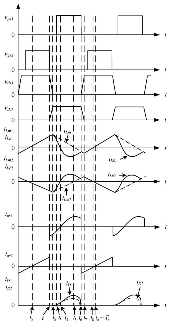 - For brief analysis convenience, the circuit is operated under positive and negative currents, and Figure 2 shows the behavior of the circuit in one cycle. For brief analysis convenience, only the time interval between t0 and t6 will be taken into account; that is, the positive magnetizing current of T1 and the negative magnetizing current of T2 both occurring at the same time will be discussed.