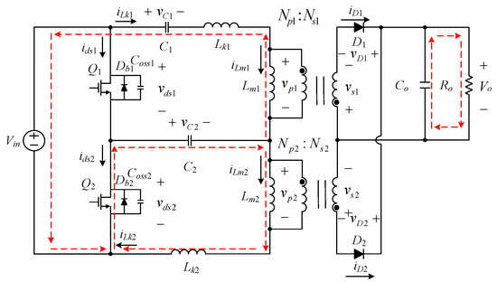 - vD1 and vD2 are the voltages on two output rectifier diodes D1 and D2, respectively; iD1 and iD2 are the currents in two output rectifier diodes D1 and D2, respectively.