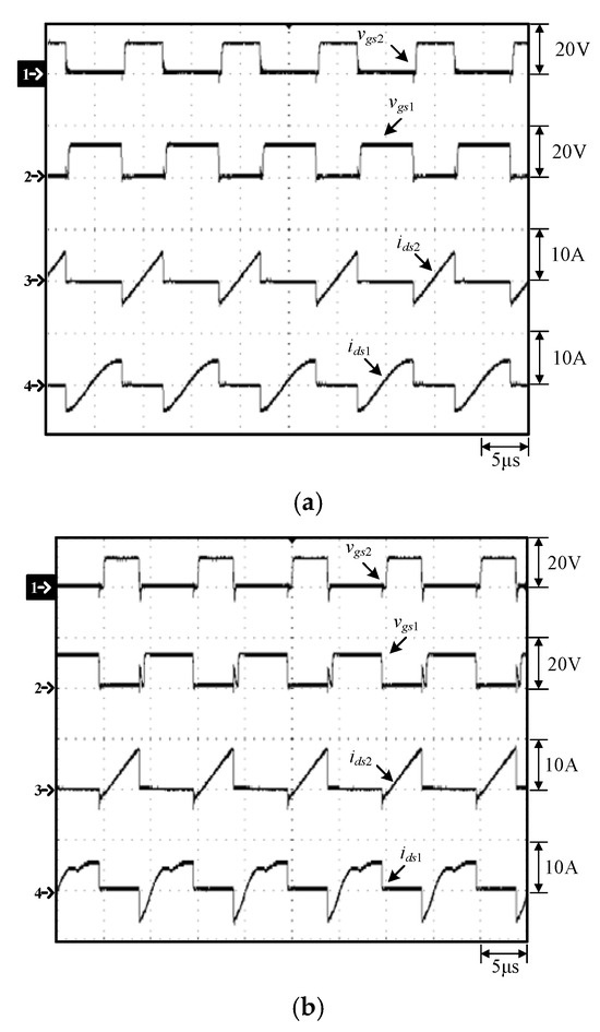 - ids1 and ids2 are the currents in the auxiliary switch Q1 and the main switch Q2, respectively; vds1 and vds2 are the voltages on the auxiliary switch Q1 and the main switch Q2, respectively; vgs1 is the gate driving signal for the auxiliary switch Q1, vgs2 is the gate driving signal for the main switch Q2, and these two signals are complementary signals, namely, 1 − D and D for Q1 and Q2, respectively.