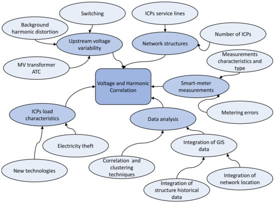 This section provides a comprehensive discussion of the factors that may affect the accuracy of the topology identification algorithm. The discussion focuses solely on algorithms that utilise voltage correlation. Furthermore, the discussion highlights the differences in correlation between harmonic measurements and RMS voltage measurements. Figure 1 illustrates how these factors can be grouped and linked.