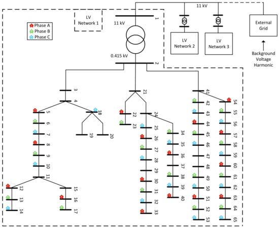 Following the establishment of a unique database of appliances for each house, power consumption and harmonic emissions were aggregated to create comprehensive load profiles. These profiles were subsequently assigned to the respective houses within the network, as shown in Figure 2. Each load profile encompasses two primary components:
