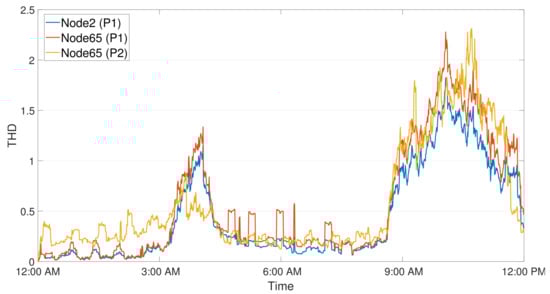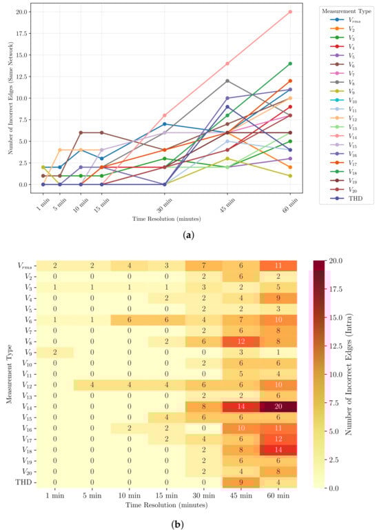 A notable observation is the non-monotonic behaviour exhibited by several harmonic components; for example, as evident in THD, , and , which show local fluctuations in similarity scores. These fluctuations refer to increases or decreases in the similarity score as the time resolution increases. Such variations, observed within the 24 h testing period, may be attributed to the network structure or the inherent variability in harmonic content throughout the daily cycle. Furthermore, this variability could be attributed to the limited testing period of one day. This behaviour suggests that the relationship between time resolution and similarity score is more complex than a simple relationship, particularly when comparing relatively close time resolutions (e.g., 45 min versus 60 min). The optimal harmonic order or time resolution for accurately identifying network topology likely depends on multiple factors, including the network structure and its complexity, load characteristics, and the length of the measurement period. Therefore, optimising the time resolution or selecting the appropriate harmonic order for a specific network would require an understanding of that system’s load behaviour, structural configuration, and measurement characteristics.