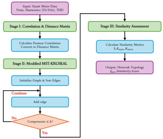 Figure 5 presents a high-level overview of the proposed algorithm for identifying the distribution network topology, while Algorithm 2 provides a more detailed description of the methodology, which consists of three main stages: