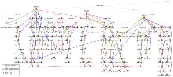 - : Spurious links across different phases or networks. A prominent example is the blue line (phase C) connecting node 45N to 14S, which violates the radial hierarchy. Similarly, the edge between node 33E (phase B) and 53S (phase A) misrepresents actual connections.