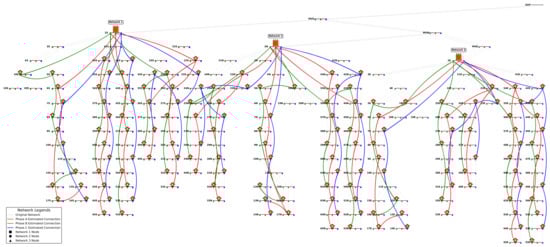 This section evaluates the performance of the proposed topology identification methodology using two measurements: and . The results are visualised for three LV distribution networks (denoted as S, N, and E), each fed by a distinct transformer connected to an MV network. Estimated topology connections are depicted as coloured lines (red, blue, and green), corresponding to the three-phase structure, whilst actual connections are shown as grey dotted lines for comparative analysis.