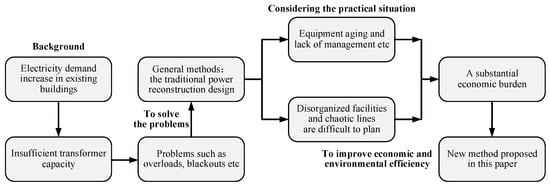 In general, the expansion of transmission capacity between buildings and the utility grid becomes necessary when the distribution system experiences frequent overload [42]. However, the reconstruction of power systems, particularly in existing buildings, presents significant challenges. The early construction of these buildings has resulted in disorganized facilities and chaotic lines, making planning difficult. Moreover, the reconstruction of an upper-level transformer substation requires the construction of power corridors. Consequently, all of these factors contribute to a substantial economic burden, as shown in Figure 1.
