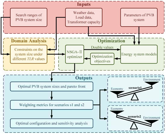 PVB system size ranges (PV, battery size) and other parameters serve as input for the models, along with weather data, load data, transformer capacity, and system constraints obtained through domain analysis. The NSGA-II optimization algorithm optimizes the configuration of the energy system with the objective of minimizing the two optimization objectives under the aforementioned constraints. NSGA-II is applied to determine the Pareto front sets. Then, two objective functions are weighted for two scenarios that emphasize the economy and environment, respectively. Finally, the optimal system configuration is obtained for the corresponding scenarios, and a sensitivity analysis is conducted on the configuration variables.