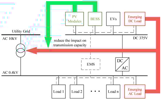 Figure 3 presents a schematic of the conventional AC distribution system found in existing buildings, which delivers electricity to users through a transformer and AC bus. Therefore, the transmission capacity is constrained by the performance of the transformer and AC bus, and can be influenced by emerging loads.