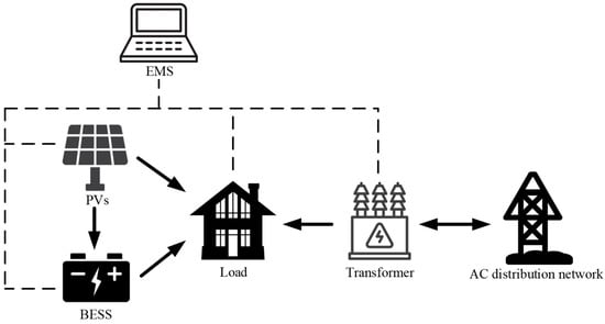 Therefore, for existing buildings that face challenges in power capacity expansion and have poor economic benefits, it is feasible to retain their original power systems (including transformer configurations) and reduce their reliance on the public grid by implementing a hybrid AC/DC PV-battery (PVB) system. This can be achieved by effectively controlling the energy flow within the system, thereby ensuring that the electric power drawn from the utility grid stays within the transformer’s rated power range. The configuration method of the PVB system, including PV capacity allocation and energy storage capacity allocation, is precisely the focus of this study.