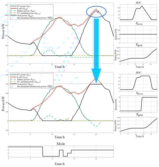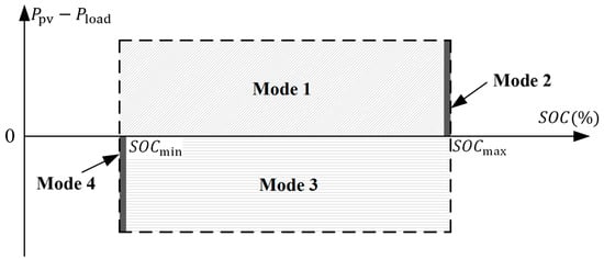 This study aims to configure the BESS optimally and reduce DTC and DCE, subject to the constraints imposed by the existing building’s transmission capacity. The charging or discharging state of the battery is governed by the disparity between generated PV energy and load energy demand. Therefore, based on the difference between and , the operational state of the system can be classified into four modes, as illustrated in Figure 6.