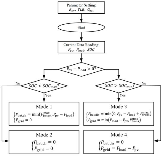 Based on the classification of modes, an appropriate operation strategy was formulated to effectively manage the energy flow within the PVB system. Figure 7 depicts the system’s operational strategy. The battery stores energy during intervals of excess PV generation and discharges power when PV output is inadequate to satisfy the building’s demand. Crucially, if exceeds , the PVB system gives precedence to procuring electricity from the power grid. Should the net load (defined as minus ) surpass , the battery supplies the additional power requirement. From an energy balance perspective, the power constraint is given by the following equation: