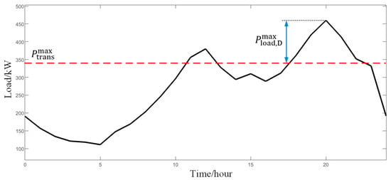 First, the typical daily load of a residential building in Shanghai is selected as the research object of this study, with a summer day chosen due to its load profile, dominated by peak cooling consumption, exhibiting the annual maximum transformer stress. This makes it a conservative benchmark for capacity constraints under extreme conditions. As shown in Figure 10, for ease of description, the peak load value above is defined as , which can be determined as follows: