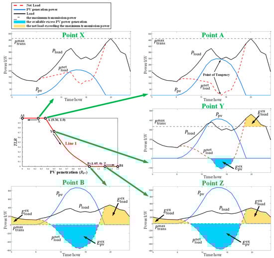 The at point X is extremely low, resulting in always being greater than 0. This implies that the PV output curve is consistently below the load curve, leading to the absence of in this situation. As the increases, the critical point (point A) reaches 0.36. At point A, a tangent point is formed between the PV output curve and load curve. Correspondingly, the net load curve is tangent to the X-axis, where is equal to zero. Along line AB, both and increase simultaneously with the increase in . However, remains equal to after energy loss. As continues to increase, a new critical point (point B) is reached. At point B, the TLR has dropped to 0, while after energy loss remains equal to . This indicates that the system no longer requires electricity from the grid and can utilize effective energy flow planning to fulfill the complete daily energy requirements solely with PV generation, thereby achieving a fully self-sufficient power supply mode. On segment BB1, as further increases, decreases while increases, as shown at point Z. Excess PV power generation can be curtailed or transmitted to the utility grid. A summary of the system analysis corresponding to the relevant points in Line 1 is shown in Table 4.