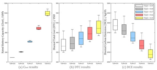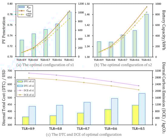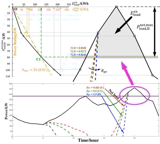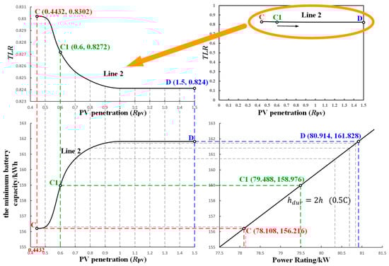 The characteristic curves demonstrate that as increases, TLR gradually decreases and eventually stabilizes at 0.824. Similarly, as increases, gradually increases and then stabilizes at 161.828 kWh. This is because a higher implies a lower under the same TLR condition. Therefore, TLR can be further reduced to achieve a larger until under each exhibits the same multiple relationship with , resulting in a higher required . Furthermore, in the lower right portion of Figure 13, the and maximum battery discharge power required for each point on Line 2 are located on the previously defined battery characteristic line, with a maximum charging/discharging rate of 0.5 C.