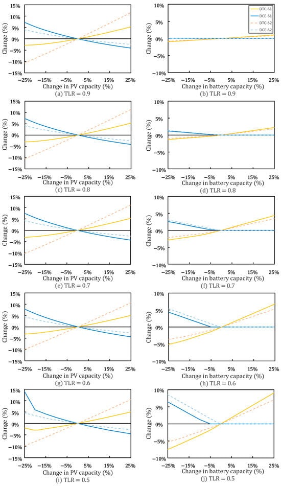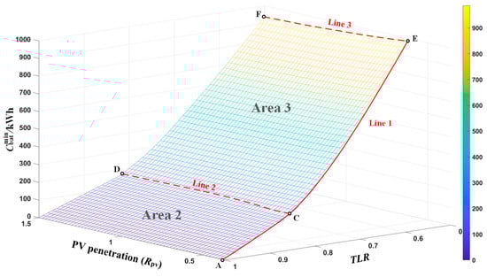 Based on the energy relationship in Figure 8, it is evident that to guarantee standard daily operation of the system, must be greater than . Considering the energy loss resulting from battery charge/discharge cycles, Line 1 can be derived through simulation, as shown by the red line in Figure 11. It is apparent that as increases, TLR gradually decreases, with the rate of decrease diminishing. This can be attributed to higher leading to greater availability of photovoltaic power generation, thereby reducing the demand for transmission capacity from the grid (i.e., TLR value). From an energy perspective, does not theoretically exist in Area 1, so this paper will not further discuss this area.