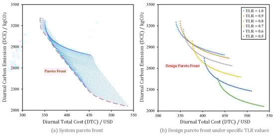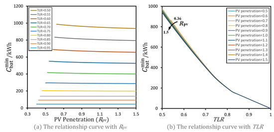 Considering the limitations of transformer capacity, there should exist a minimum storage capacity () under each TLR value and , which can meet the minimum requirements for the normal operation of the system. The , along with the corresponding and TLR values, can provide constraints for the search range in subsequent multi-objective optimizations. Therefore, before optimizing the system configuration, it is necessary to simulate the above constraints to obtain an effective region within the independent variable domain.