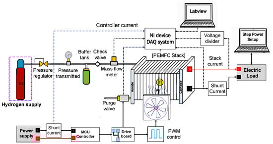 A mass flow meter (M-20SLPM-D, Alicat Scientific, Tucson, AZ, USA) was installed at the hydrogen inlet to measure the hydrogen flow rate. Additionally, a thermocouple (5 TC-TT-T-36-72, Omega, Michigan City, IN, USA) was placed at the center of the stack to continuously monitor the operating temperature. Experimental data were recorded and collected during the operation using an NI 1919 card and LabVIEW 2014 software through data acquisition (DAQ) blocks. Subsequently, experiments were conducted under various combinations of operating parameters, such as load current, hydrogen supply pressure, purge duration, and purge interval. These experiments were carried out in two configurations: one with a buffer tank and the other without.