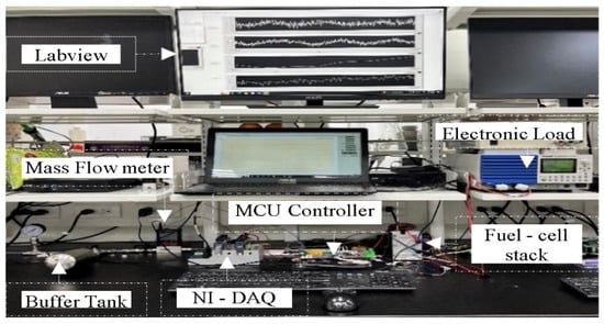 To evaluate the effectiveness of the proposed method, experiments were conducted using the test platform illustrated in Figure 1 and Figure 2. Figure 1 presents a schematic of the experimental setup, while Figure 2 shows a photograph of the actual system. The experiments were performed under two conditions: one with a buffer tank installed and one without. Other than the inclusion of the buffer tank, both setups were identical. The buffer tank, positioned after the mass flow meter and before the inlet of the fuel cell, served as a temporary hydrogen reservoir to support system performance during purge operations.