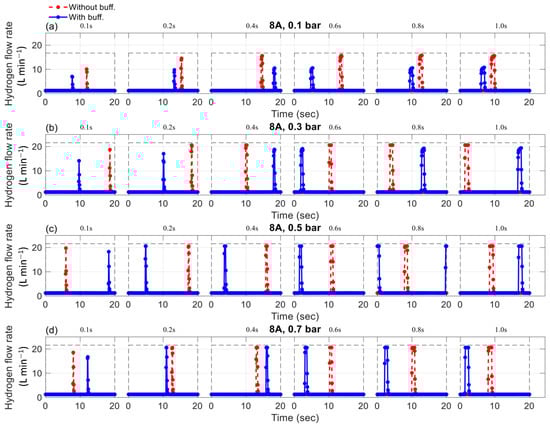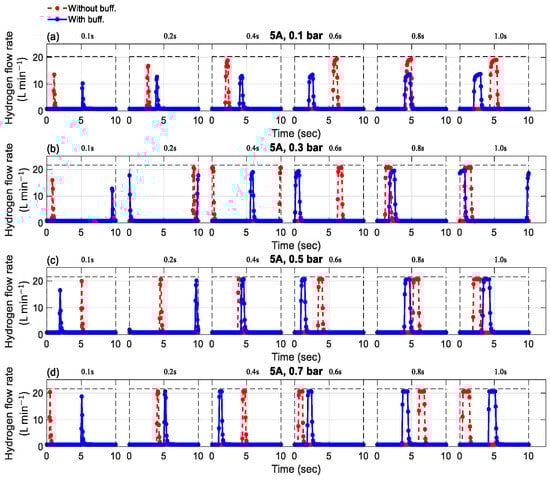 The effects of purge duration on the mass flow rate, with a purge interval of 10 s for a current load of 5-A, are shown in Figure 3. Similarly, the effects of purge duration on the mass flow rate, with a purge interval of 20 s for a current load of 8 A, are shown in Figure 4. Although there are cases with 1 A and 8 A for 10 s and 1 A and 5 A for 20 s, only symbolic representations of 5 A for 10 s and 8 A for 20 s are given due to the limitations in this article. Since the control of purge duration and interval is independent of the current, the effects of purge duration on the mass flow rate at 1 A and 8 A for 10 s and 1 A and 5 A for 20 s were almost identical to those observed at 5 A for 10 s and 8 A for 20 s, respectively. The experiments were conducted to analyze pressure variations, with comparisons made between setups with and without a buffer tank for each studied case. The key observations are summarized below.