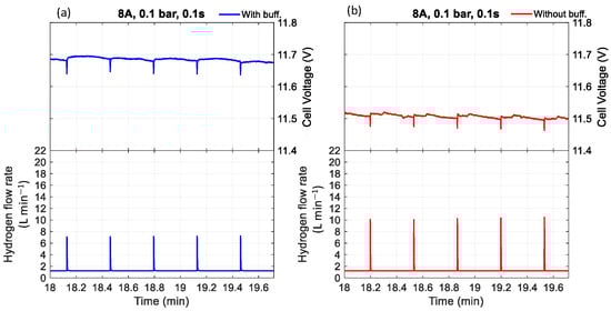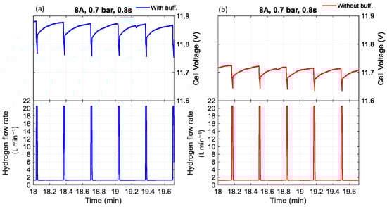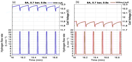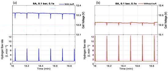 The effect of purging duration and buffer tank on voltage with a purge interval of 20 s, current of 8 A, pressure of 0.1 bar, and purge duration of 0.1 s (a) with buffer tank, (b) without buffer tank.