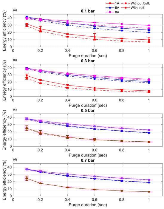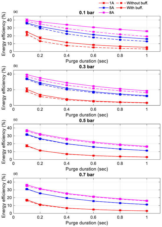 Energy efficiency comparison between cases without a buffer tank and with a buffer tank with a purge interval of 10 s at 1 A, 5 A, and 8 A (a) 0.1 bar, (b) 0.3 bar, (c) 0.5 bar, (d) 0.7 bar.