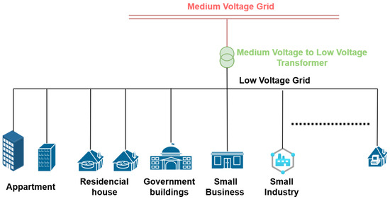 The low-voltage grid supplies electricity to various consumer types, including apartments, residential houses, government buildings, small businesses, and small industries.