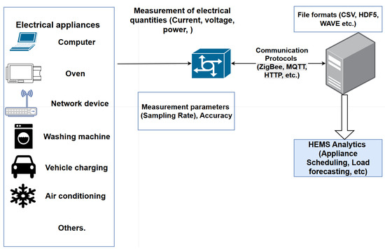 HEMS performs appliance scheduling and analytics locally via onboard controllers, but the cloud storage offers several complementary benefits. It enables long-term data retention, remote monitoring, system updates, and advanced analytics using centralized machine-learning models. Additionally, cloud infrastructure supports scalability, allowing integration with utility demand-response programs and cross-household energy optimization—capabilities that may exceed the processing and storage limitations of local controllers. A typical NILM data collection framework for HEMS is depicted in Figure 3. Electrical appliances, such as computers, ovens, and washing machines, are monitored using sensors or meters to measure electrical quantities (e.g., current, voltage, power). Parameters like sampling rate and accuracy influence these measurements. Data are transmitted via communication protocols (e.g., ZigBee, MQTT, HTTP) to a central server, stored in various file formats (e.g., CSV, HDF5, WAVE), and used for HEMS analytics, including appliance scheduling and load forecasting.