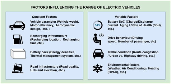 Range prediction is a complex and challenging problem that depends on numerous influential factors. A data-driven energy consumption prediction method for EVs, developed in [37] for energy-efficient routing, has demonstrated both high prediction accuracy and ease of use. Several parameters influence the range of vehicles, including state of charge (SoC), ambient temperature, driving behavior, route, and traffic, as shown in Figure 4. The weightage of influencing parameters on EV range prediction has the following values: 54% SoC, 25% ambient temperature, 10% driver behavior, 6% route, 5% traffic, according to [38]. The accuracy of the estimated range for an electric vehicle (EV) mainly depends on the accuracy of the state of charge (SoC) estimation. The driving range depends upon both estimating the remaining energy in the battery and predicting the future energy consumption pattern of the remaining trip.