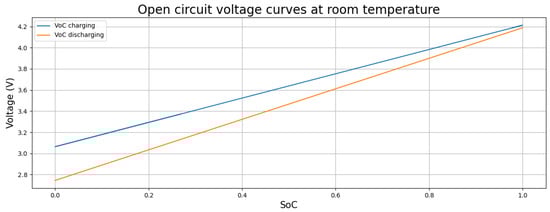 The SoC of a battery indicates the level of charge remaining in percentage compared to its maximum available capacity. It is a crucial parameter for the charging/discharging strategies to protect the battery from overcharging/overdischarging. In [39], the authors critically analyzed the various algorithms for estimating the Li-ion battery state of charge (SoC). The real-time, accurate estimation of SoC in EVs is challenging because of the strong time-variables and nonlinear characteristics with the driving loads and operational conditions [28]. Open-circuit voltage (OCV) profiles play a crucial role in SoC estimation as they provide a direct relationship between voltage and battery capacity. During charging and discharging, the OCV changes with SoC due to battery chemistry, hysteresis effects, and ageing, making accurate profiling essential for precise estimation. By leveraging OCV-SoC characteristics, BMS can improve SoC accuracy. Charging and discharging events are best detected and managed locally by onboard energy-management systems. However, characterizing and understanding the voltage hysteresis phenomenon observed during these cycles provides valuable insights into battery degradation trends. A difference between the open-circuit voltage (OCV) curves during charging and discharging indicates voltage hysteresis, often caused by kinetic limitations, phase transitions, or irreversible electrochemical reactions. This hysteresis reflects energy loss and can signal reduced efficiency or degradation mechanisms within the battery.