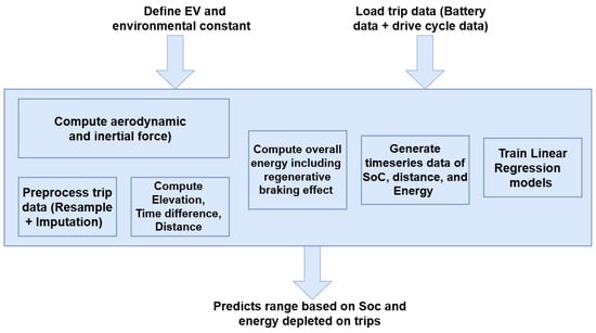 Block diagram of range prediction system’s workflow is illustrated in Figure 6. The methodology employed in this study integrates real-world physics-based computations to analyze vehicle energy consumption, incorporating aerodynamic drag, rolling resistance, and inertial forces. A data-driven approach utilizing linear regression is applied to predict future range and energy depletion based on historical trip data. Furthermore, the methodology includes visualization techniques to assess trip efficiency, enabling a comprehensive evaluation of energy usage patterns for electric vehicle performance analysis. It begins by defining EV and environmental constants while loading trip data, including battery and drive cycle data. The data undergo preprocessing (resampling and imputation), followed by computing elevation, time difference, and distance. Aerodynamic and inertial forces are then calculated, leading to the computation of overall energy consumption, including regenerative braking effects. The system generates time-series data for SoC, distance, and energy, which is then used to train linear regression models and predicts range. Modeling of the range prediction service to a Measurify model is straightforward and mapped as in Table 2.