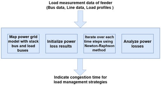 Figure 7 depicts a block diagram of power flow analysis to calculate power losses in the feeder to know the congestion time (overload time) to reduce energy wastage for distribution system operators. It uses the Newton–Raphson method for power system studies. It begins with the load measurement data of the feeder, including bus data, line data, and load profiles. The next step involves mapping the power grid model, incorporating a slack bus and multiple load buses to represent the network structure. Then, power loss results are initialized, and the Newton–Raphson method is used to iterate over various time steps, solving power flow equations dynamically. The computed results help in analyzing power losses, which are crucial for identifying periods of high congestion. Ultimately, these insights help identify congestion times, enabling effective load management strategies to enhance system efficiency and reliability. The application domain can be easily mapped to the Measurify framework as in Table 3.