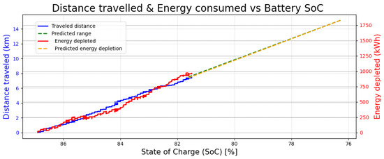 The relationship between battery SoC, distance traveled, and energy depletion, highlighting the near-linear energy consumption pattern and the accuracy of the predicted range estimation for efficient EV trip planning.