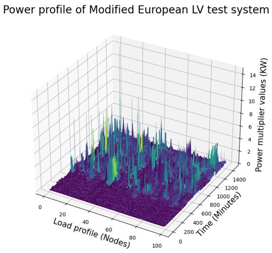 The power flow analysis utilizes time-series load shapes for the 55 loads served by the test feeder, with a one-minute time resolution over one day, enabling a detailed assessment of load variations and their impact on grid performance. Figure 10 illustrates the power profile of the Modified European LV test system, showing variations in power multiplier values (in kW) across different load profile nodes over 24 h (measured in minutes) as in Equation (3). The 3D plot highlights fluctuations in power demand across the network. The X-axis represents the load profile across distribution nodes, the Y-axis captures power consumption dynamics over time, and the Z-axis indicates power demand intensity at specific nodes and intervals, in kW. The residential power consumption remains zero for the first 300 min, suggesting a minimal load before 5 AM. Identifying peak demand periods enables the implementation of demand-side management strategies to enhance grid stability.