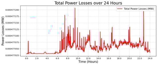 Figure 11 shows the variation in total power losses (in MW) over 24 h. The real power loss in a transmission line connecting bus i and bus j is calculated as , where each term is derived using the bus voltage magnitudes, conductance , susceptance , and the phase angle difference as in Equation (5). The red plot highlights the power loss trend, helping to analyze system efficiency and performance variations over time. A spike in power loss despite no load at feeder nodes before 1 AM could be caused by reactive power flow, transformer/core losses, leakage currents, or system imbalances. Factors like capacitor switching, no-load transformer excitation, or sudden voltage fluctuations may also contribute to these losses. The fluctuations in power losses indicate varying load conditions throughout the day after 6 AM, with noticeable peaks during specific time intervals.