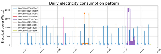 Figure 12 illustrates the daily electricity consumption pattern of nine electrical appliances—fridge, dishwasher, microwave, water kettle, washing machine, radio with amplifier, dryer, kitchenware, and bedside light—over a weekday in Building1, a single-floor apartment in Klagenfurt occupied by a young couple who are mostly away on weekdays and spend evenings and weekends at home. Each appliance is represented by a different colour, showing its electrical power usage in watts over time. The data reveal distinct usage signatures, where some appliances operate periodically with sharp peaks (e.g., blue), indicating cyclical or automated use, likely corresponding to devices such as a fridge, while others (e.g., pink, orange, and purple) display sporadic high-power consumption, suggesting short bursts of activity, which is typical of electric kettles, washing machines, dishwashers, and kitchenware. The naming format appears to be a MAC address-like device ID, commonly used in Zigbee-based smart home energy monitoring systems for wireless communication with a central hub. Among high-power-consuming appliances, 000D6F00029C2BD7, 000D6F0003562C48, and 000D6F000353AE51 correspond to the water kettle, dishwasher, and kitchenware (oven), respectively. The pink power pattern, characterized by a short, high-power spike, corresponds to a kettle being used around 7 AM for breakfast preparation. The orange pattern, characterized by an initial high-power phase, a lower-power cycle, and a final high-power phase, corresponds to a washing machine, suggesting operation during off-peak hours to optimize electricity costs. The purple pattern, marked by an initial surge above 2 kW followed by a steady draw of approximately 200 W, is typical of an oven, likely used for evening meal preparation, aligning with typical household cooking routines.