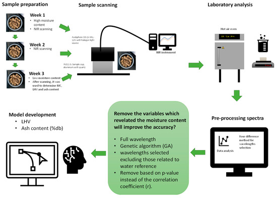 Near-infrared (NIR) spectroscopy is emerging as a powerful tool for evaluating the internal quality of food, agricultural products, and even biomass [6,7,8]. Its appeal lies in its speed, affordability, and versatility, making it ideal for process optimization, advanced control, and product improvement [9,10]. These advantages have extended beyond food and agriculture, finding applications in various industries to assess combustion characteristics [10]. Notably, the biofuel and bioenergy sectors are increasingly harnessing NIR techniques to predict biomass quality attributes accurately [8,9]. Posom et al. [6] used NIR to check the quality of pelletized biomass, including the MC, volatile matter, fixed carbon content, and ash content; it is a fast verification method, using energy values as an index for determining pricing together with weight. However, the current pricing system only uses weight. However, if the biomass has a high MC or contains other impurities like sand, the weight increases, and using weight alone for pricing cannot accurately determine the true calorific value [11]. Therefore, factors that impact the energy value measured by NIR include moisture content and ash quantity. Shi et al. [12] defined the higher heating value (HHV) as “the amount of heat released from the combustion of a certain amount of fuel, assuming its combustion product water returned to the liquid state at the end of the measurement, taking the latent heat of vaporization of product water into account”, while the LHV is the heat released under conditions where the product water remains in vapor form and its latent heat of vaporization is not recovered. The HHV can be determined using a bomb calorimeter and estimated by calculating ultimate or proximate analysis data. The LHV can be theoretically calculated as a function of the HHV by subtracting moisture content [13]. Thus, the LHV represents the real energy content and is an important parameter for estimating combustion process design parameters. Under actual operating conditions, the LHV is more useful than the HHV [14], though the HHV is more frequently reported.
