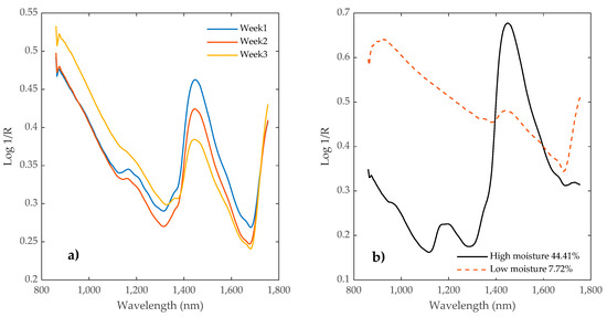 Near-infrared (NIR) absorbance spectra expressed as Log(1/R). (a) Spectral profiles of samples measured at three weekly points, illustrating temporal variations in reflectance. (b) Comparison of spectral profiles for samples with high moisture content (44.41%) and low moisture content (7.72%), demonstrating the influence of moisture levels.