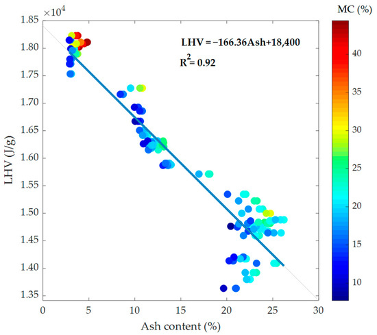 Figure 3 illustrates the relationship between LHV and ash content. The results show that the LHV decreased with increasing ash content, having an empirical model of LHV = −166.36 Ash + 18,400, and r2 of 0.92. The results are similar to the research of Nielsen et al. [31,32], who reported the energy content of biomass was determined by its calorific value, including HHV and LHV, which are influenced by biomass elemental composition, ash content, and MC. MC is the most important factor that influences the calorific value of biomass. Both moisture and ash content decrease the energy yield of biomass fuels. While moisture reduces energy due to evaporation losses, ash content reduces the proportion of combustible material. Therefore, biomass with low moisture and low ash content is preferred for efficient energy generation [33]. In addition, this study was similar to the reported of Posom et al. [4], who applied NIR spectroscopy to the evaluation of the moisture content (MC) and higher heating value (HHV) of Leucaena leucocephala pellets and found that the MC and HHV of Leucaena leucocephala pellets increased with decreasing moisture content.