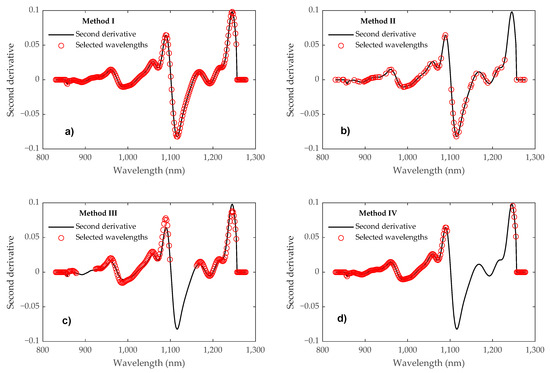 - Method III: This method was applied to the wavelengths selected excluding those related to water reference [21,22,23]. It removed variables relevant to water in the ranges of 960–1024 nm and 1402–1512 nm. Then, remaining variables were used to develop the models.
