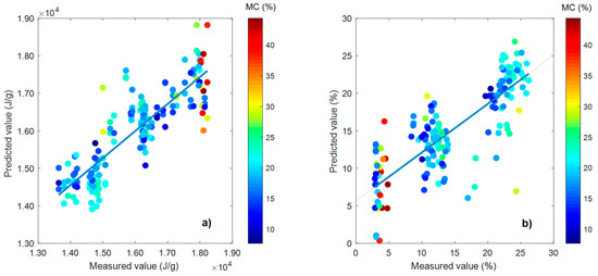 Predicted versus measured values for (a) energy content (J/g) and (b) ash content (%) of biomass samples using GA-PLS regression modeling. Each point represents a sample, color-coded by its moisture content (MC, %). Higher moisture levels tend to influence prediction accuracy, especially for ash content.