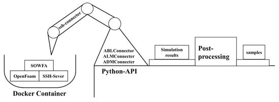 - Python API for simulation management: A Python API was developed to interact with the SOWFA container via SSH. This API provides high-level functions to