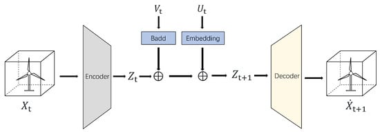 Directly modeling the high-dimensional spatio-temporal evolution of the wind field using standard recurrent NNs can be challenging due to the large state size and complex dynamics. Inspired by the structure of the N-S Equation (2), where spatial derivatives (, , ) are coupled with the temporal derivative () and the nonlinear advection term , an NN architecture is proposed that attempts to decouple the learning of spatial features from temporal dynamics using an autoencoder (AE) framework combined with latent space evolution. This is motivated by the idea that the AE can learn a low-dimensional representation of the complex spatial patterns (like vortices and shear layers) while the latent dynamics model learns how these patterns translate and evolve over time, driven by inputs like turbine controls and boundary conditions. The architecture is shown in Figure 2.
