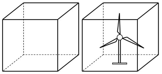 - Turbine wind box (): A box containing a single wind turbine centered within it. The NN model for this box () is trained to predict the flow evolution considering the turbine’s presence and its operating parameters (), based on uniform or pre-calculated non-uniform inflow ().