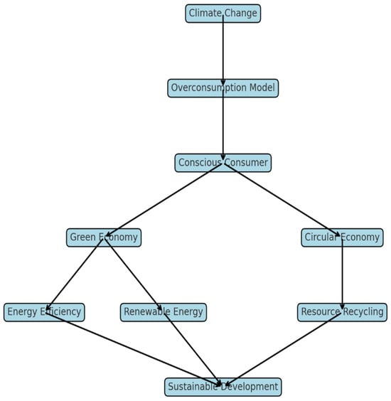 Figure 1 illustrates how recognizing climate change necessitates a review of the current economic model, which is based on excessive consumption, and the development of conscious consumer behavior. This change in consumer attitude underpins the rise in green and circular economic models that support sustainable development by promoting energy efficiency, renewable energy, and resource recycling [11,12,13,14,15,16,17,18]. The figure shows the logical connections between these processes, emphasizing the complex systemic nature of economic restructuring.
