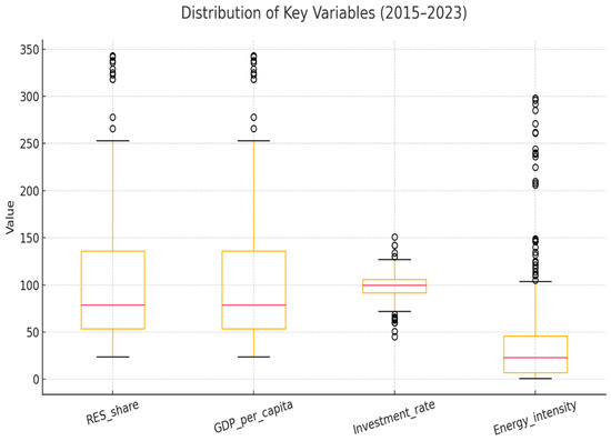 These three variables were selected because they represent three fundamental structural factors among all the macroeconomic determinants of the share of renewable energy. The choice of the model variables is based on theoretical foundations. GDP per capita, as an indicator of economic development, is frequently used in the environmental economics literature to measure environmental transformation and technological adaptation capacity [42]. The investment rate directly influences the development of renewable energy infrastructure, as predicted by endogenous growth models [43,44]. Energy intensity reflects the energy efficiency of the economy, which is related to the adoption of renewable energy technologies and the efficiency of the energy transition [45]. These three indicators thus cover the demand, supply, and technological structural determinants of the share of renewable energy.