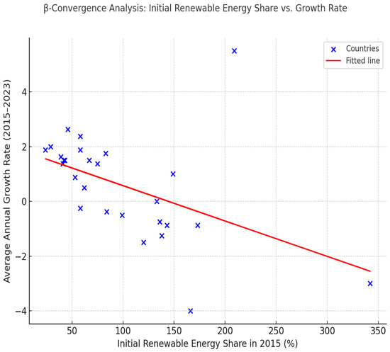 The convergence–divergence test was used to measure whether the standard deviation of the renewable energy share among the EU Member States decreased between 2010 and 2025, and whether countries with a lower initial share grew faster.