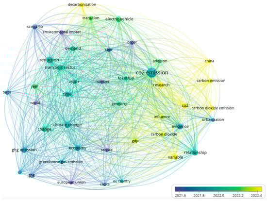 Our bibliometric analysis was conducted using the VOSviewer version 1.6.20 methodology, as proposed by [22]. This approach allows for the visualization of co-occurrence networks, enabling us to systematically map major research trends in the areas of electric vehicle (EV) adoption, transport sector greenhouse gas (GHG) emissions, and policy interventions related to decarbonization. By analyzing keyword co-occurrences, we were able to identify thematic clusters and assess the evolution of scientific attention across different subfields within sustainable transport.