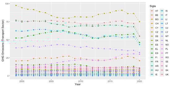 Beginning with a broader perspective, the study by González et al. [23] analyzed CO2 emissions from passenger cars in Western Europe, ranging from 1990 to 2015. Their findings indicate that while advancements in technology and improvements in fuel efficiency have helped to curb emissions, this progress has been offset by increases in economic activity and motorization rates. Utilizing a similar methodology that we use in this article, that is, a dynamic panel data model, the authors investigated how factors such as the dieselization of the vehicle fleet, mobility trends, and economic growth influence CO2 emissions in the EU-13 countries. Their work highlights the necessity of not only addressing but also understanding the economic growth-related emissions drivers to achieve deeper reductions.