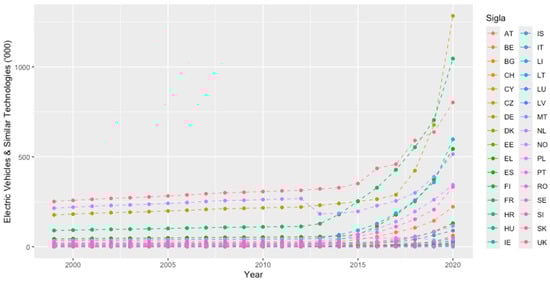 The problem of missing data was solved by their respective geometric interpolation, and in the case of country-wise unavailability, it was assumed that these variables grow (or shrink) according to the total level of stock of vehicle dynamics, without loss of information. (It is worth highlighting some additional methodological changes: i. The ACEA and Eurostat Dataset refer to the end of the year, except for BE: 1 August (1 July in 2012), CH: 30 September, and LI: 1 July; ii. for some countries, we relied on national statistics (IE, FI, UK, ME, RS) or estimates made by Eurostat; iii. taxis are usually included; iv. HR: from 2009, light vans are included in passenger cars; v. FR: 2013–2019 data were revised, data until 2012 included private cars < 15 years old, and the data are provisional for 2020; vi. the data for Poland were taken from the PZPM (Polish Automotive Industry Association) for vehicle categories > 3.5 t, and for Romania, this refers to sales (APIA)). All data were retrieved from the following agencies: i. the Association des Constructeurs Européens d’Automobiles (ACEA), ii. The National Automobile Manufacturers’ Associations, iii. Eurostat, iv. The European Environmental Agency, v. the European Commission Oil Bulletin (non-UK), and vi. BEIS Fuels Survey (UK).