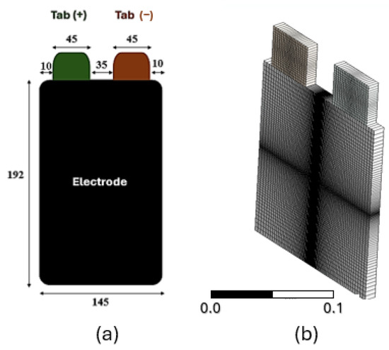 Schematic diagram of the battery cell (a) with dimensions in mm, showing the electrode and tab locations. (b) 3D view (all measurements in millimeters).